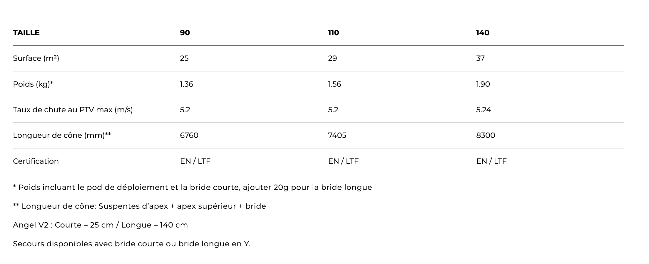 Les trois tailles disponibles de l’Angel V2 couvrent des poids allant jusqu’à 140kg (poids total suspendu).